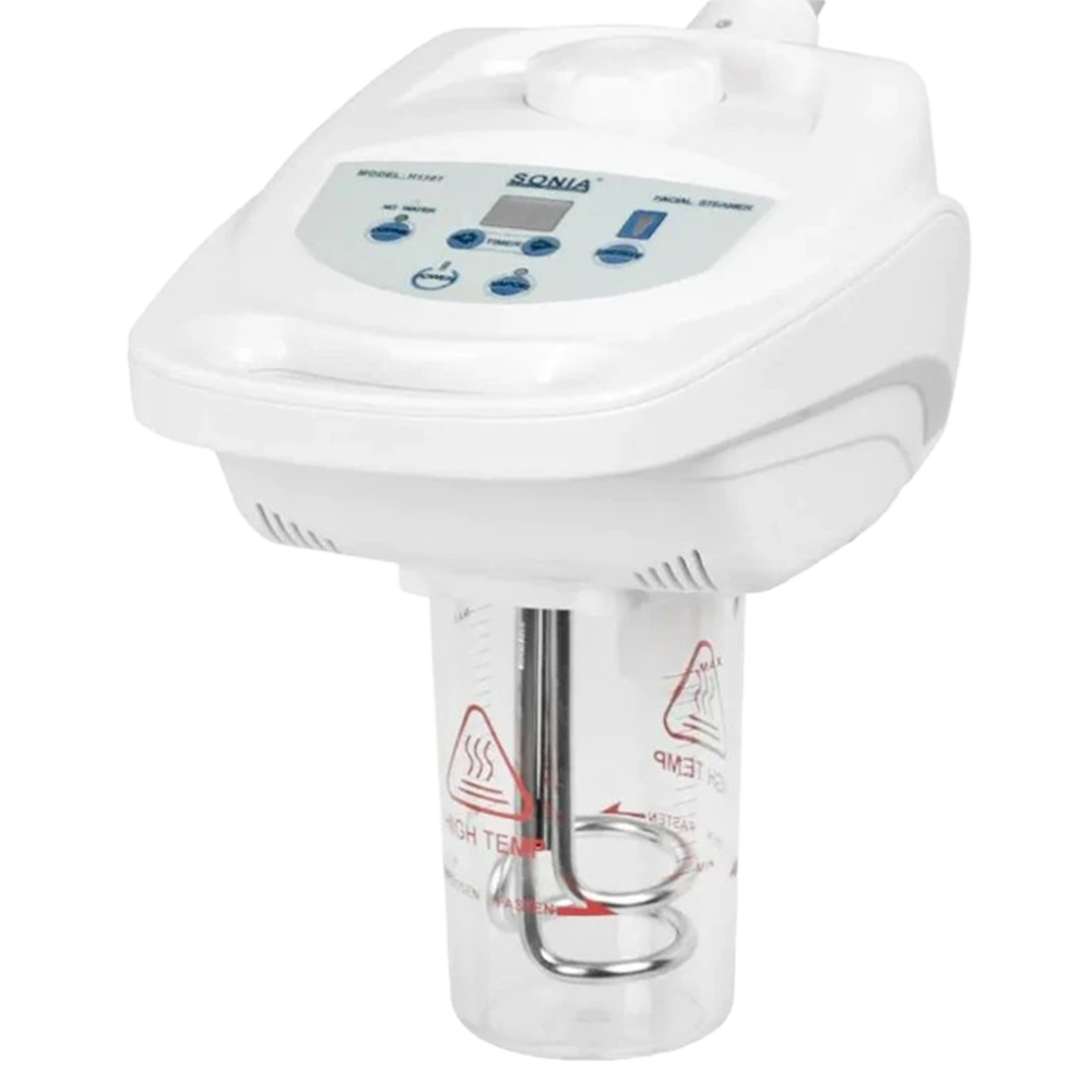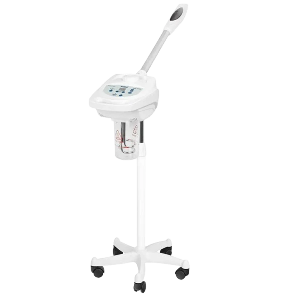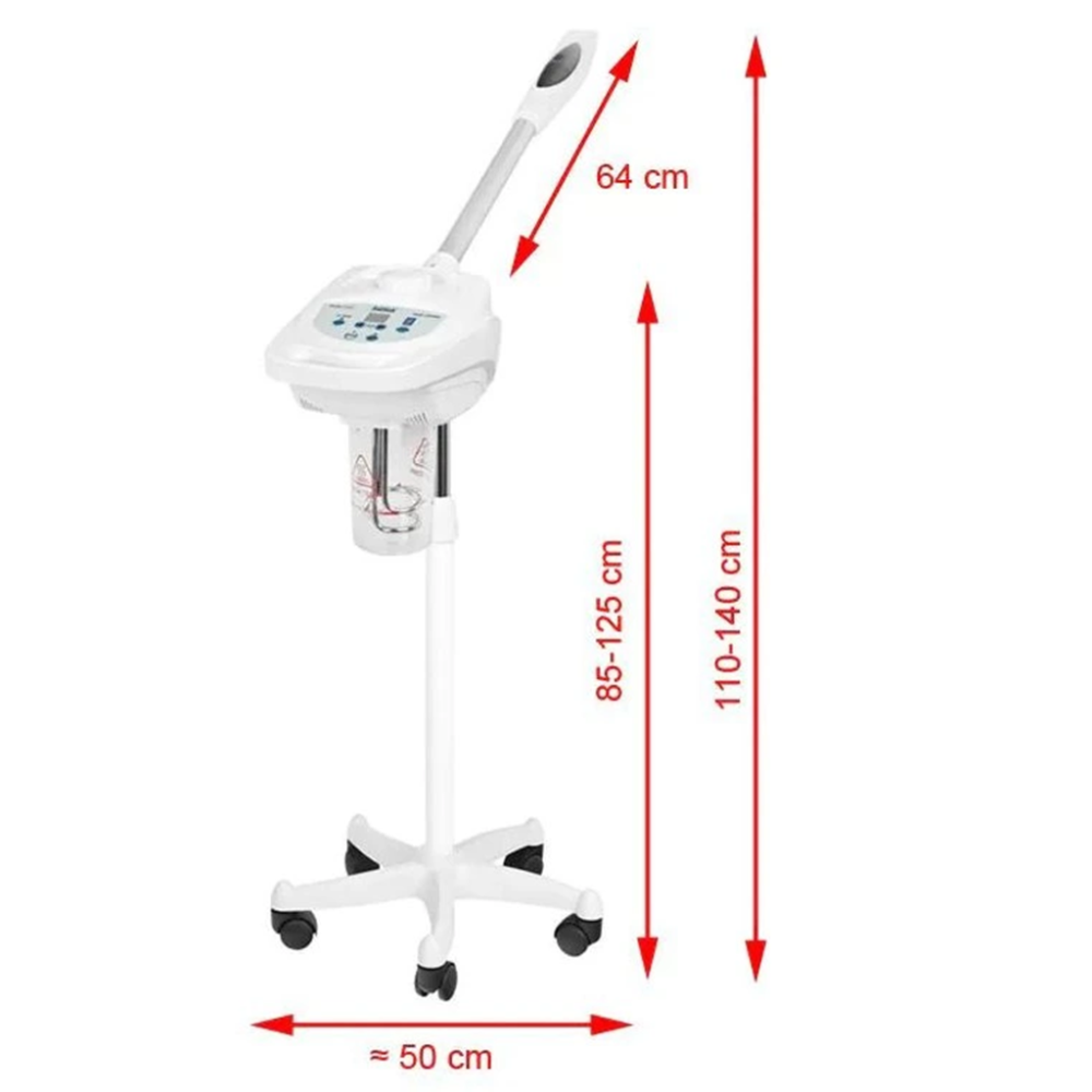 Multifunkčný naparovač s horúcou parou a ozónom, s nastaviteľným časovačom a intenzitou pary. Zariadenie je umiestnené na stabilnom stojane a má moderný dizajn s podstavcom z nehrdzavejúcej ocele. Dýza naparovača je pevne upevnená a nie je ohybná.