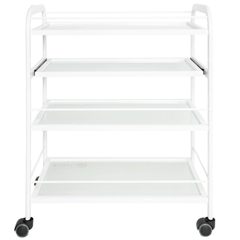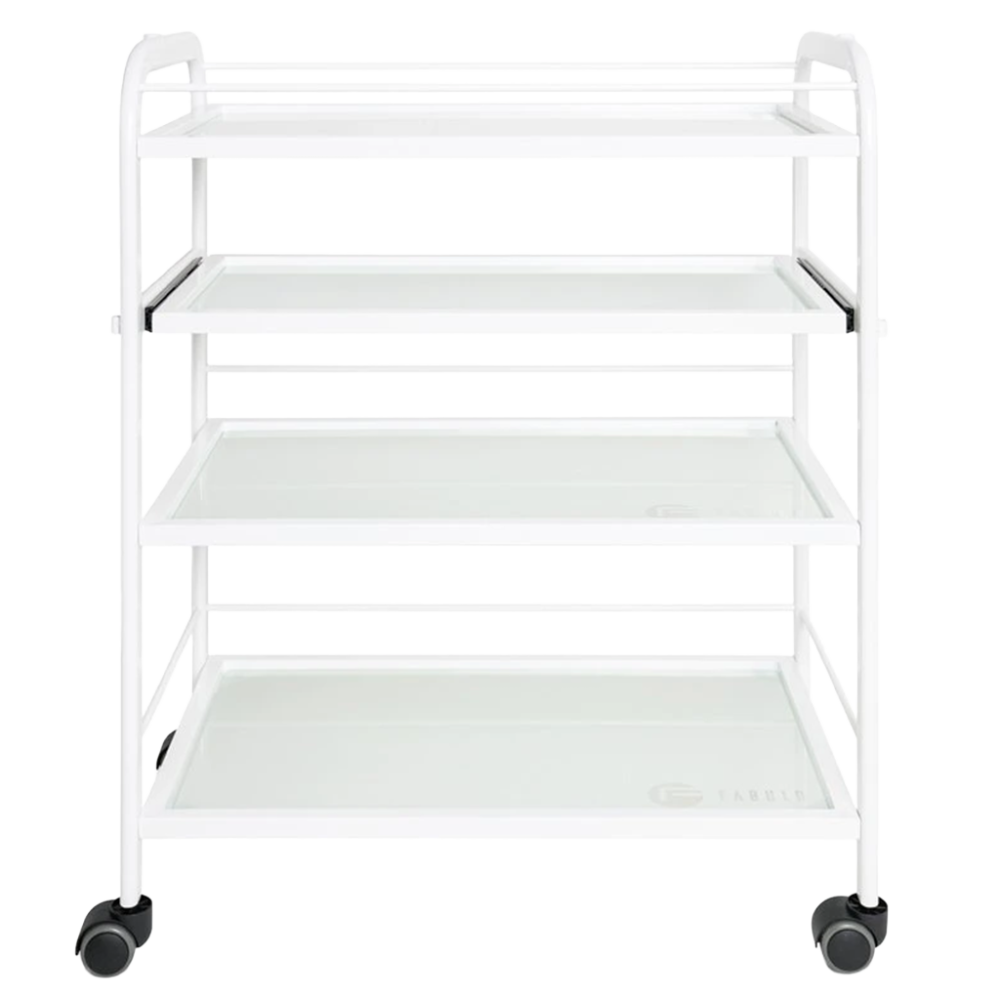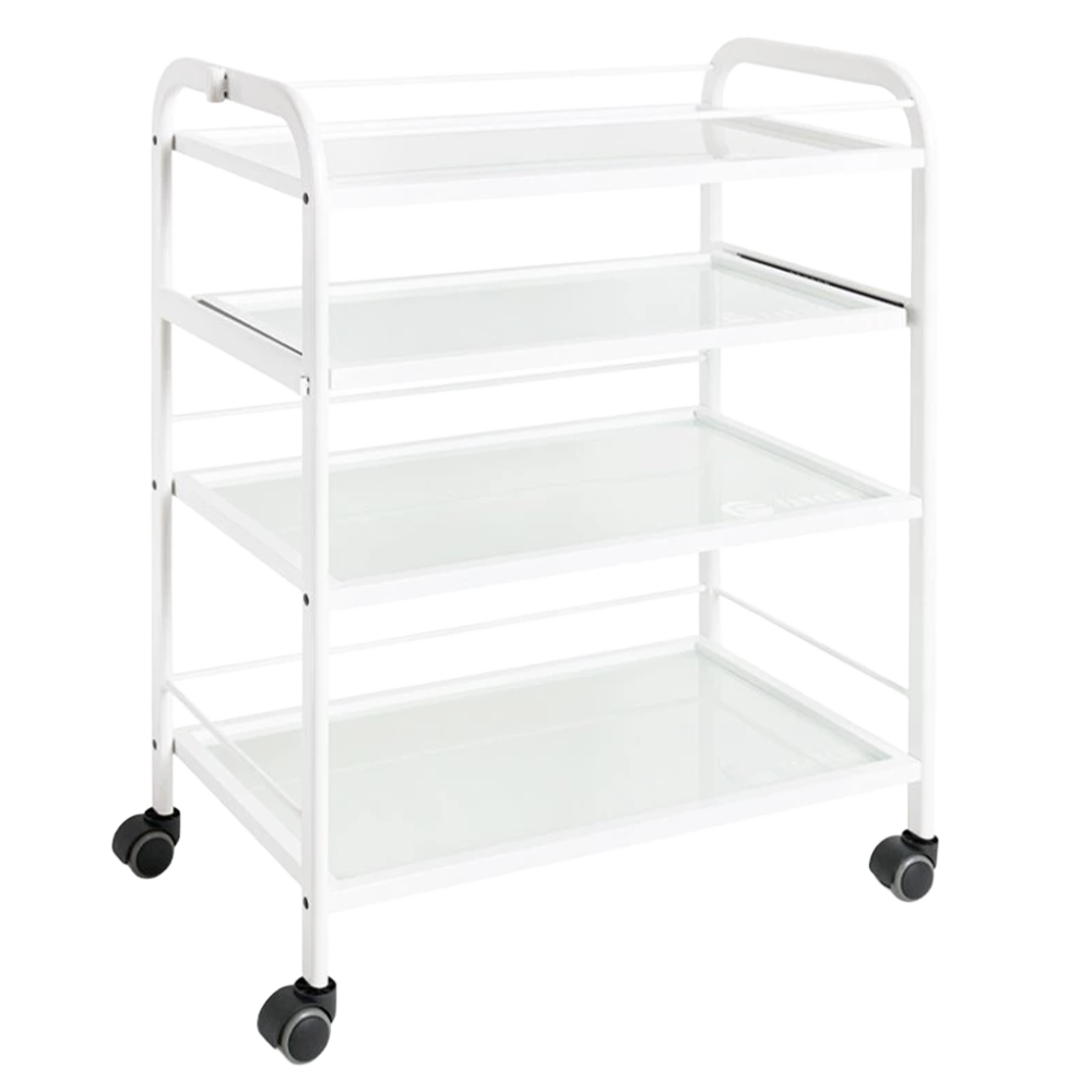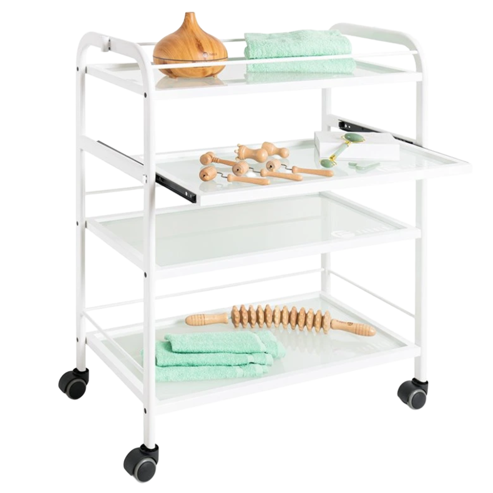 Praktický kozmetický vozík Trend je vybavený štyrmi sklenenými poličkami, z ktorých je jedna výsuvná. Funkčný stolík umožňuje uloženie kozmetických prístrojov, zariadení a rôznych pomôcok. Vďaka 4 kolieskam je stolík plne mobilný a ľahko sa presúva. Kovová konštrukcia bielej farby je veľmi stabilná a je vhodná aj na upevnenie kozmetickej lampy, prípadne iných pomôcok. Kozmetický stolík Trend s minimalistickým dizajnom je ideálnym doplnkom každého kozmetického či pedikérskeho salónu.