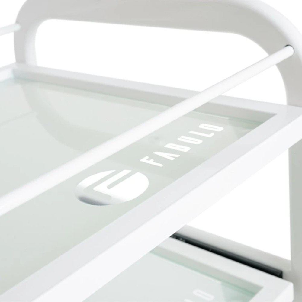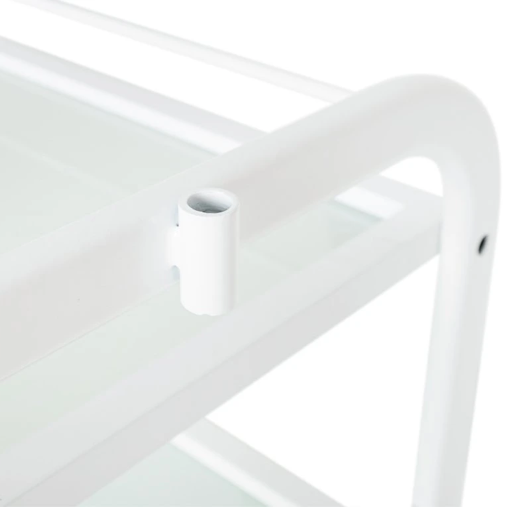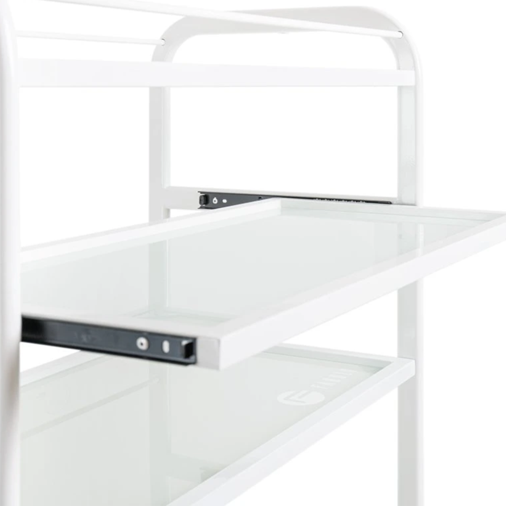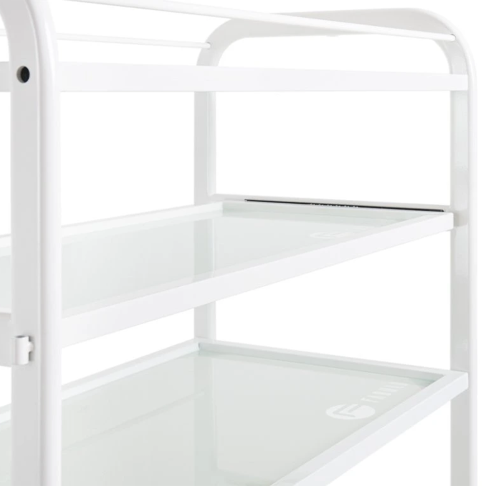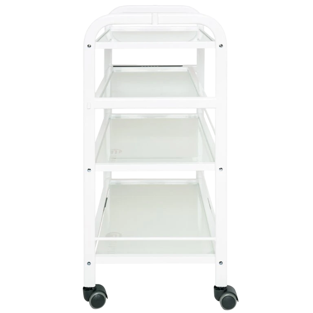 Praktický kozmetický vozík Trend je vybavený štyrmi sklenenými poličkami, z ktorých je jedna výsuvná. Funkčný stolík umožňuje uloženie kozmetických prístrojov, zariadení a rôznych pomôcok. Vďaka 4 kolieskam je stolík plne mobilný a ľahko sa presúva. Kovová konštrukcia bielej farby je veľmi stabilná a je vhodná aj na upevnenie kozmetickej lampy, prípadne iných pomôcok. Kozmetický stolík Trend s minimalistickým dizajnom je ideálnym doplnkom každého kozmetického či pedikérskeho salónu.